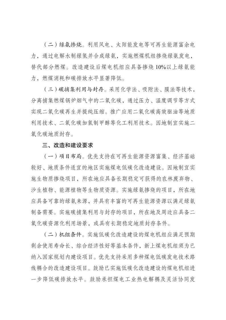 其中指出:利用風(fēng)電、太陽能發(fā)電等可再生能源富余電力,通過電解水制綠氫并合成綠氨,實施燃煤機組摻燒綠氨發(fā)電,替代部分燃煤。改造建設(shè)后煤電機組應(yīng)具備摻燒10%以上綠氨能力,燃煤消耗和碳排放水平顯著降低。二、改造和建設(shè)方式(二)綠氨摻燒。利用風(fēng)電、太陽能發(fā)電等可再生能源富余電力,通過電解水制綠氫并合成綠氨,實施燃煤機組摻燒綠氨發(fā)電,替代部分燃煤。改造建設(shè)后煤電機組應(yīng)具備摻燒10%以上綠氨能力,燃煤消耗和碳排放水平顯著降低。(三)碳捕集利用與封存。采用化學(xué)法、吸附法、膜法等技術(shù),分離捕集燃煤鍋爐煙氣中的二氧化碳,通過壓力、溫度調(diào)節(jié)等方式實現(xiàn)二氧化碳再生并提純壓縮。推廣應(yīng)用二氧化碳高效驅(qū)油等地質(zhì)利用技術(shù)、二氧化碳加氫制甲醇等化工利用技術(shù)。因地制宜實施二氧化碳地質(zhì)封存。三、改造和建設(shè)要求(一)項目布局實施綠氨摻燒的項目,所在地應(yīng)具備可靠的綠氨來源,并具有豐富的可再生能源資源以滿足綠氨制備需要。實施碳捕集利用與封存的項目,所在地及周邊應(yīng)具備二氧化碳資源化利用場景,或具有長期穩(wěn)定地質(zhì)封存條件。(二)機組條件。鼓勵承擔(dān)煤電工業(yè)熱電解耦及靈活協(xié)同發(fā)電、煤電安全高效深度調(diào)峰等技術(shù)攻關(guān)任務(wù)的機組實施低碳化改造。鼓勵煤炭與煤電聯(lián)營、煤電與可再生能源聯(lián)營“兩個聯(lián)營”和沙漠、戈壁、荒漠地區(qū)大型風(fēng)電光伏基地配套煤電項目率先實施綠氨摻燒示范。煤電低碳化改造建設(shè)項目應(yīng)嚴(yán)格執(zhí)行環(huán)境管理制度,確保各類污染物達(dá)標(biāo)排放。綠氨摻燒項目氨存儲設(shè)施原則上應(yīng)建于煤電機組廠區(qū)外,項目實施單位應(yīng)進(jìn)一步明確并嚴(yán)格執(zhí)行具體管理要求。四、保障措施(三)優(yōu)化電網(wǎng)運行調(diào)度。研究制定煤電低碳化改造建設(shè)項目碳減排量核算方法。推動對摻燒生物質(zhì)/綠氨發(fā)電、加裝碳捕集利用與封存設(shè)施部分電量予以單獨計量。(四)加強技術(shù)創(chuàng)新應(yīng)用。加強煤電摻燒生物質(zhì)、低成本綠氨制備、高比例摻燒農(nóng)作物秸稈等技術(shù)攻關(guān)。原文如下:(來源: 氫能觀察)請點擊查看通知原文